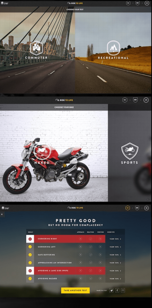 For beginner riders, engagement content included immersive hazard tests and tips. For more experienced riders content included travel guides, richly illustrated with authentic photography and narrative video.