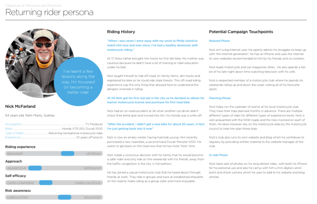 After exploring research from the Centre for Road Safety we engaged with motorcyclists across a range of ages and abilities to understand their motivations for and approaches to riding.