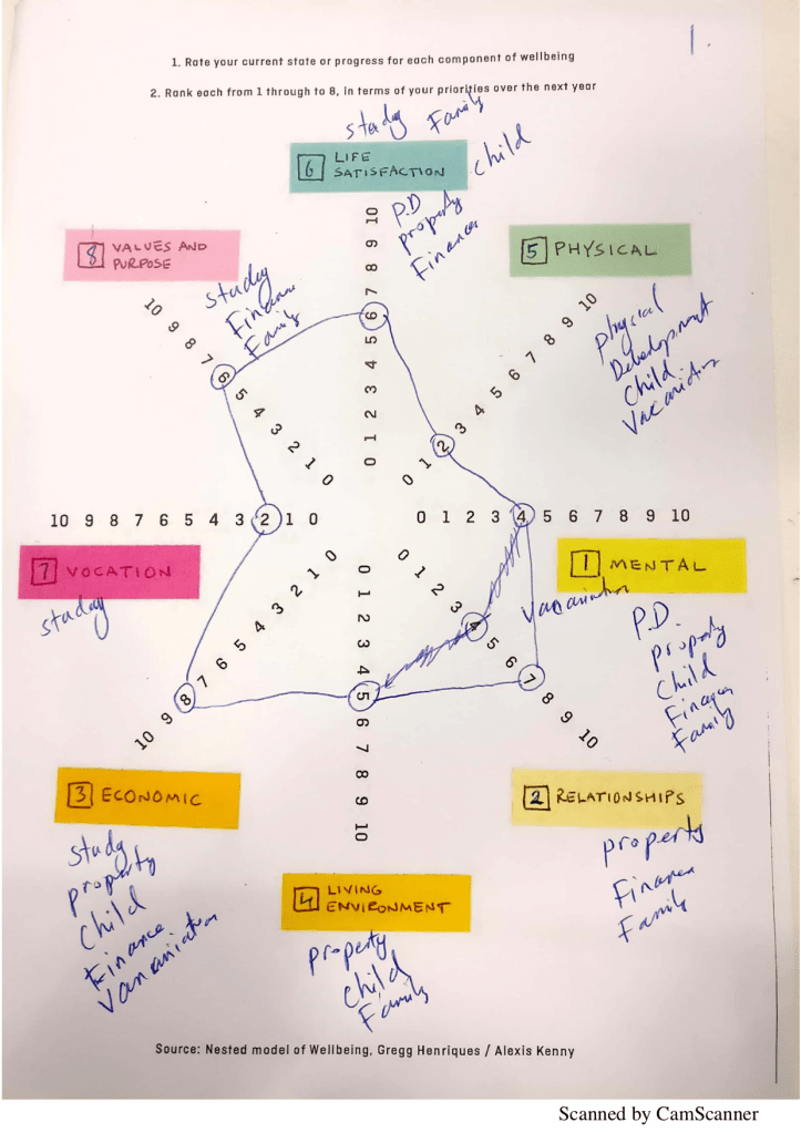 An 8-factor model, or ‘wellbeing wheel’, based on the nested model of wellbeing was used as one of the research activities with customers.