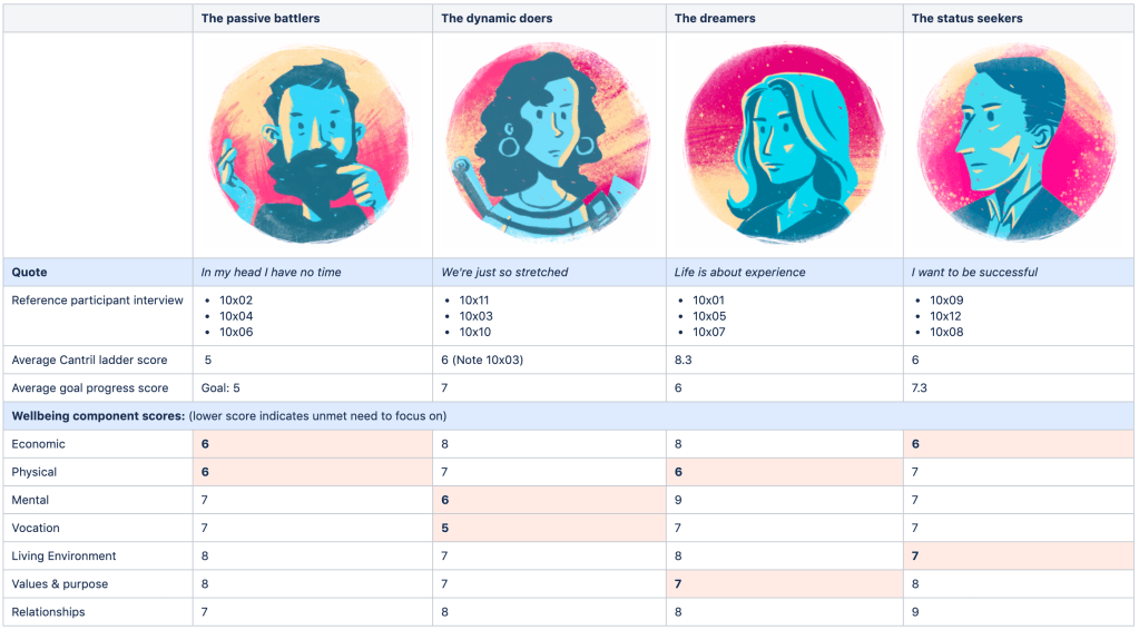 Behavioural archetypes were drafted by grouping participants with common attributes such as wellbeing scores and wellbeing needs areas.