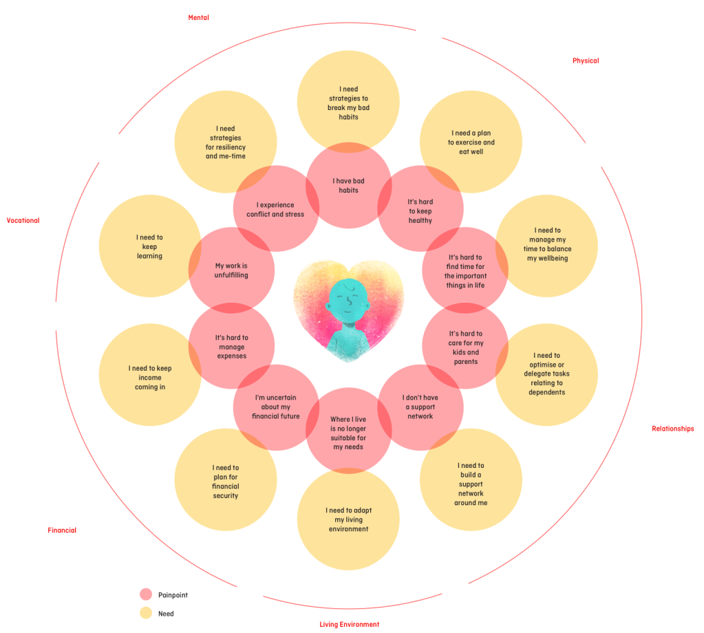 Stories, needs and painpoints from our participants’ challenges and wellbeing achievements were assembled into a journey where many opportunities for support were identified.